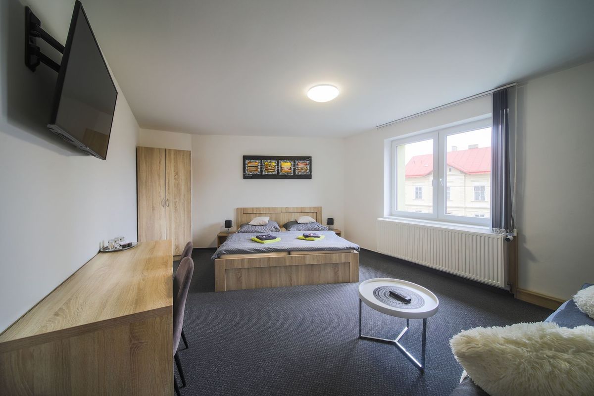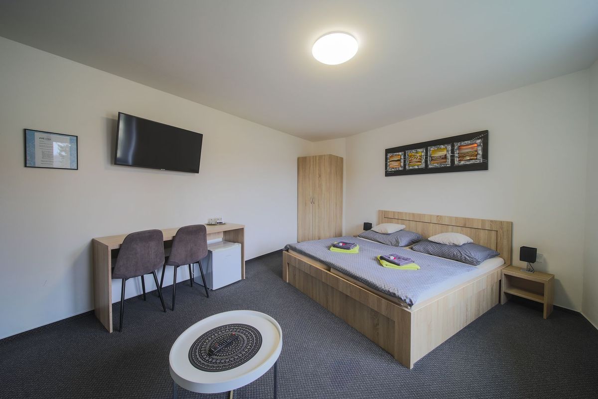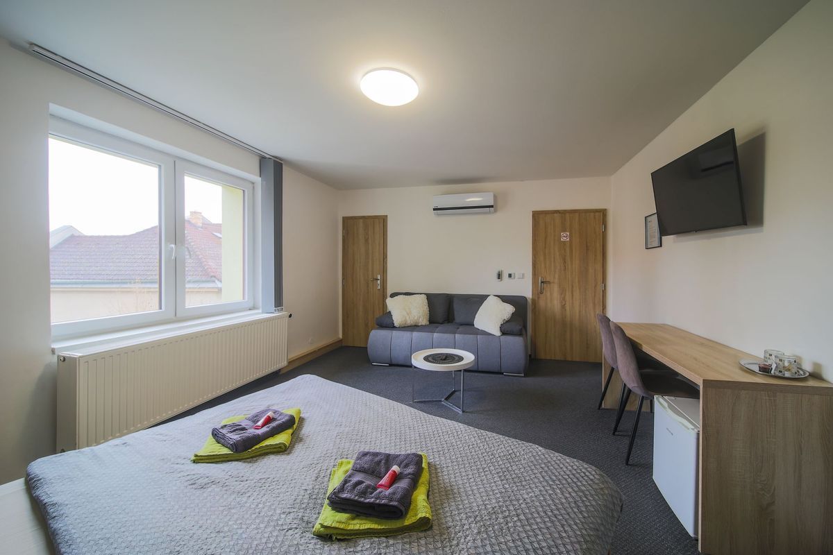 Dominantou pokoje je pohodlná manželská postel doplněná komfortním rozkládacím gaučem, který poskytuje další místo k odpočinku. Díky tomu je pokoj vhodný až pro tři hosty. Samozřejmostí je vlastní koupelna se sprchovým koutem a toaletou, která zajišťuje plné soukromí během pobytu.